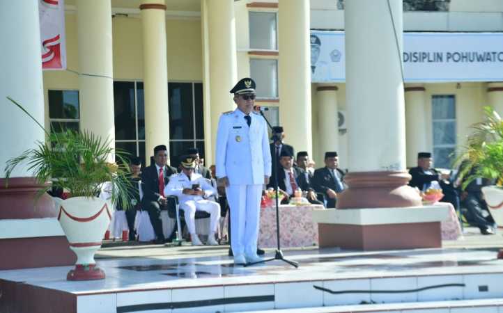 Upacara tersebut dipimpin langsung Bupati Pohuwato, Saipul A. Mbuinga, dan dihadiri Wakil Bupati, Iwan S. Adam, Ketua DPRD Pohuwato, Beni Nento, unsur Forkopimda, serta jajaran pemerintah daerah.