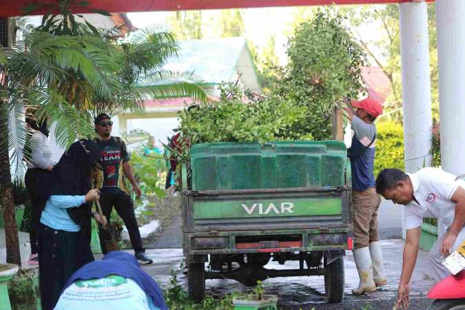 Dipimpin Sekretaris Dinas Lingkungan Hidup (DLH) Kabupaten Pohuwato, Martin Rabiasa, Puluhan pegawai dan petugas kebersihan bergotong royong membersihkan halaman kantor, rumput di lapangan dan memperindah sekretariat Posko sampah.